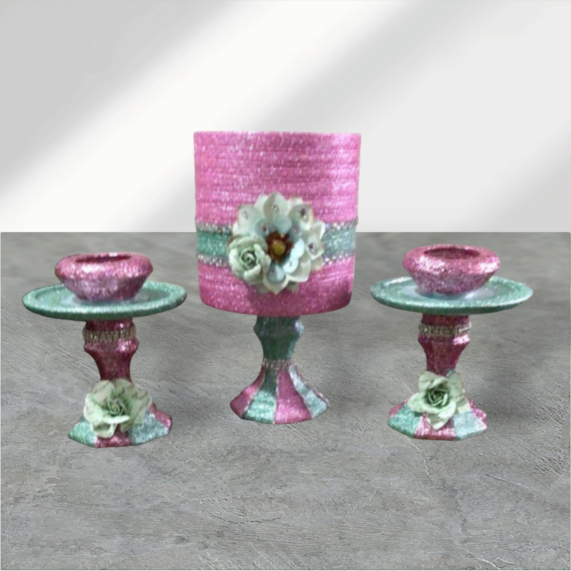 Elevate the ambiance of any room with this elegant 3-piece Pink & Mint Candle Holder Set. The soft pastel colors add a touch of tranquility while the sturdy design ensures durability. Perfect for creating a relaxing atmosphere, this set is a must-have for any home.