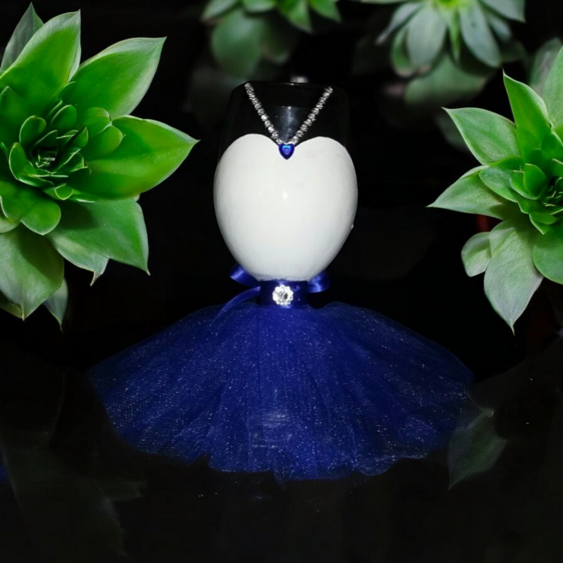 This blue ball own champagne glass is beautifully adorned with a blue ball gown design, adding a touch of elegance to any occasion. Made of durable glass, it is perfect for celebrations and special events. With its stunning design and sturdy construction, it is the ideal companion for toasting and sipping on your favorite bubbly.