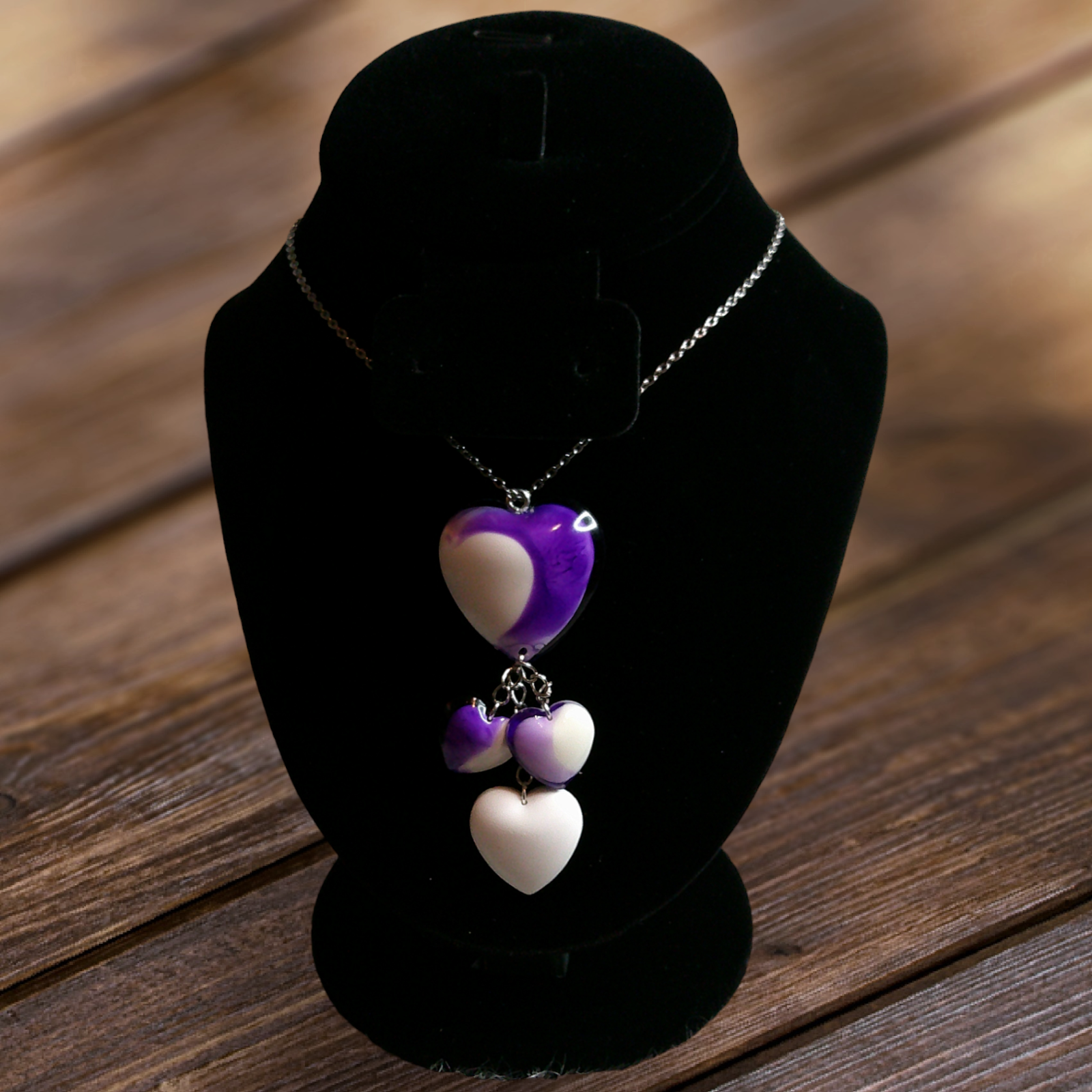 This 4Hearts/Purple necklace is a stylish and elegant accessory that will add a touch of sophistication to any outfit. The delicate design features four hearts in a beautiful purple hue, making it a perfect gift for someone special or a treat for yourself. Enhance your look with this charming necklace.