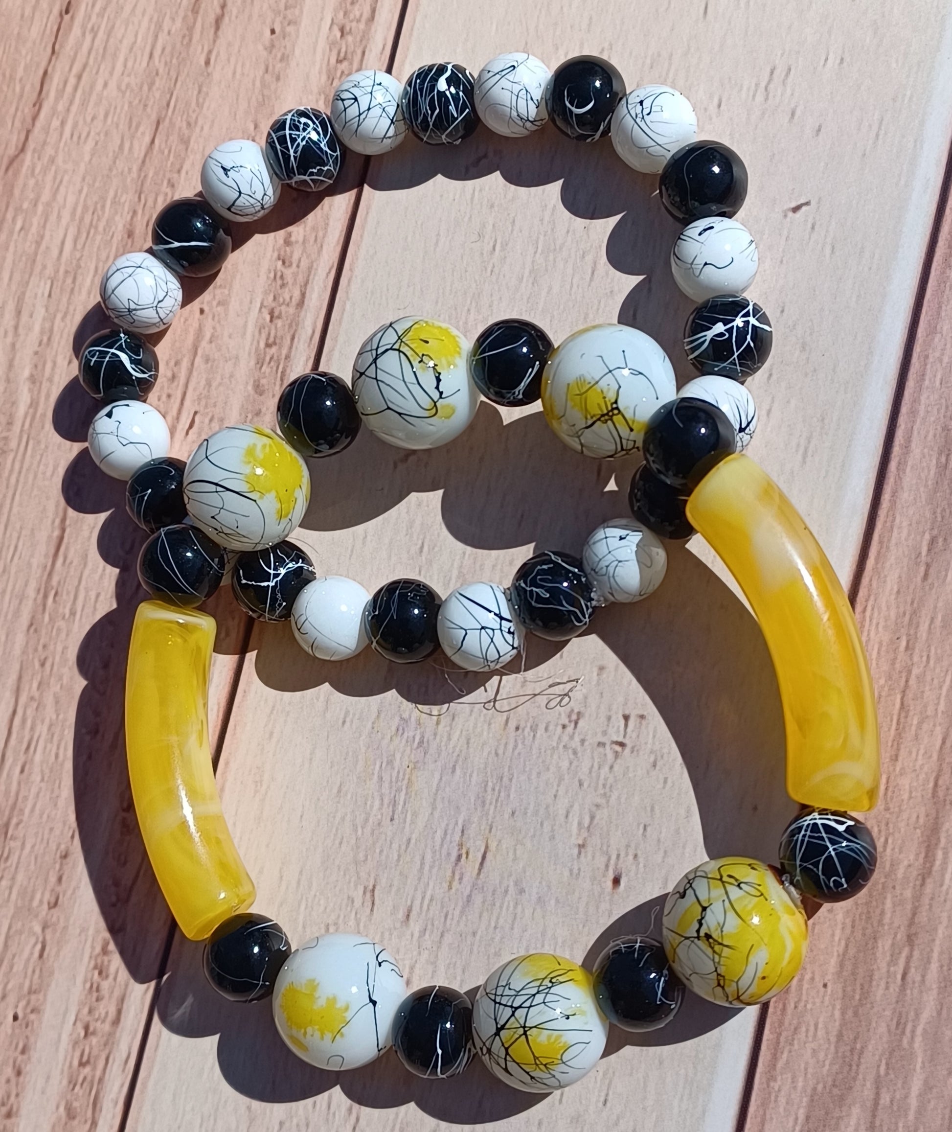 Add a pop of color to your accessory collection with our yellow, white and black glass beaded bracelet. Each glass bead is carefully crafted to create a unique and stylish combination. Elevate any outfit with this versatile and eye-catching bracelet.