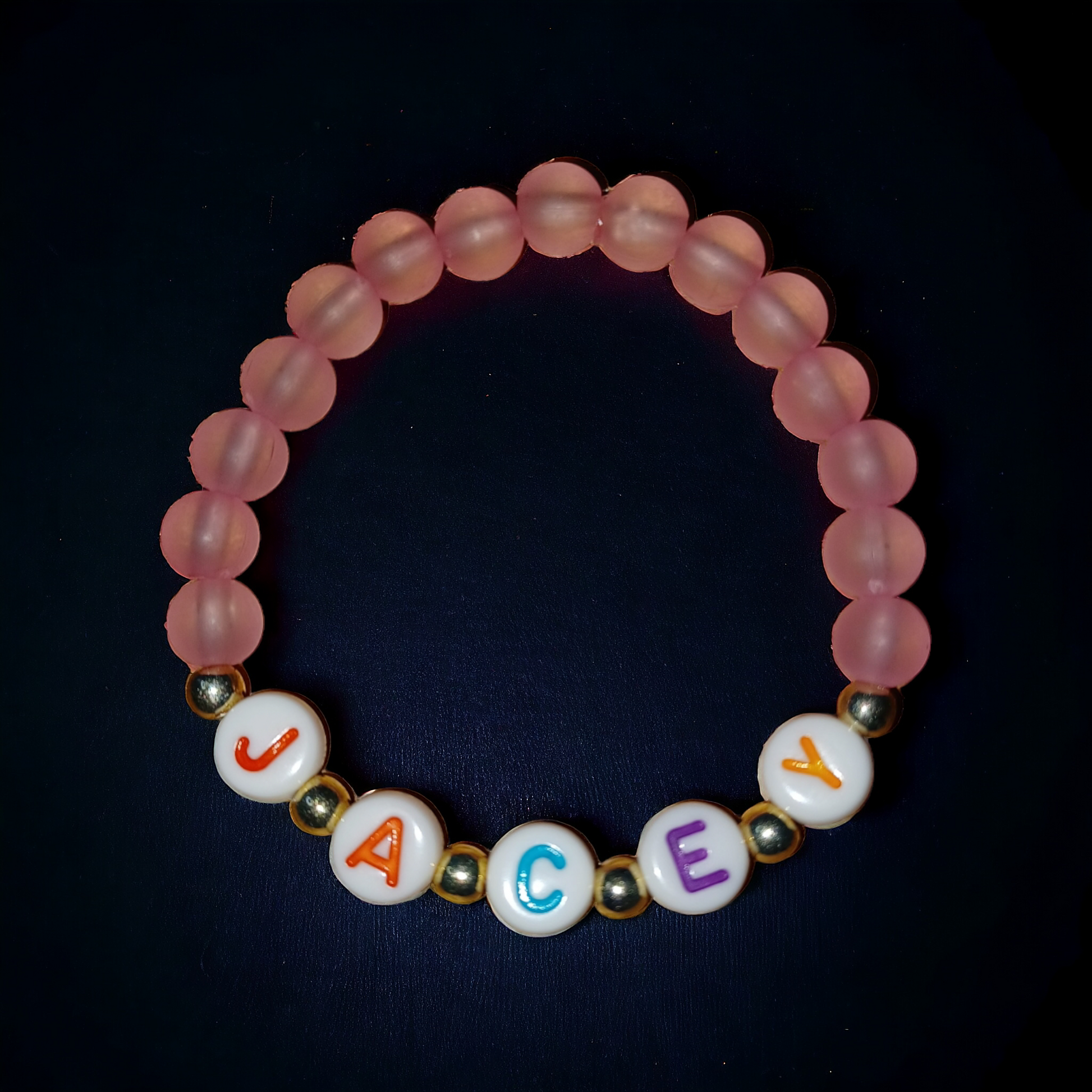 This name bracelet with pink beads is the perfect accessory for any child. Made with high-quality materials, it is both stylish and durable. Personalize it with your child's name for a unique touch. Give your child the gift of a cute and trendy bracelet that they will love to wear every day.