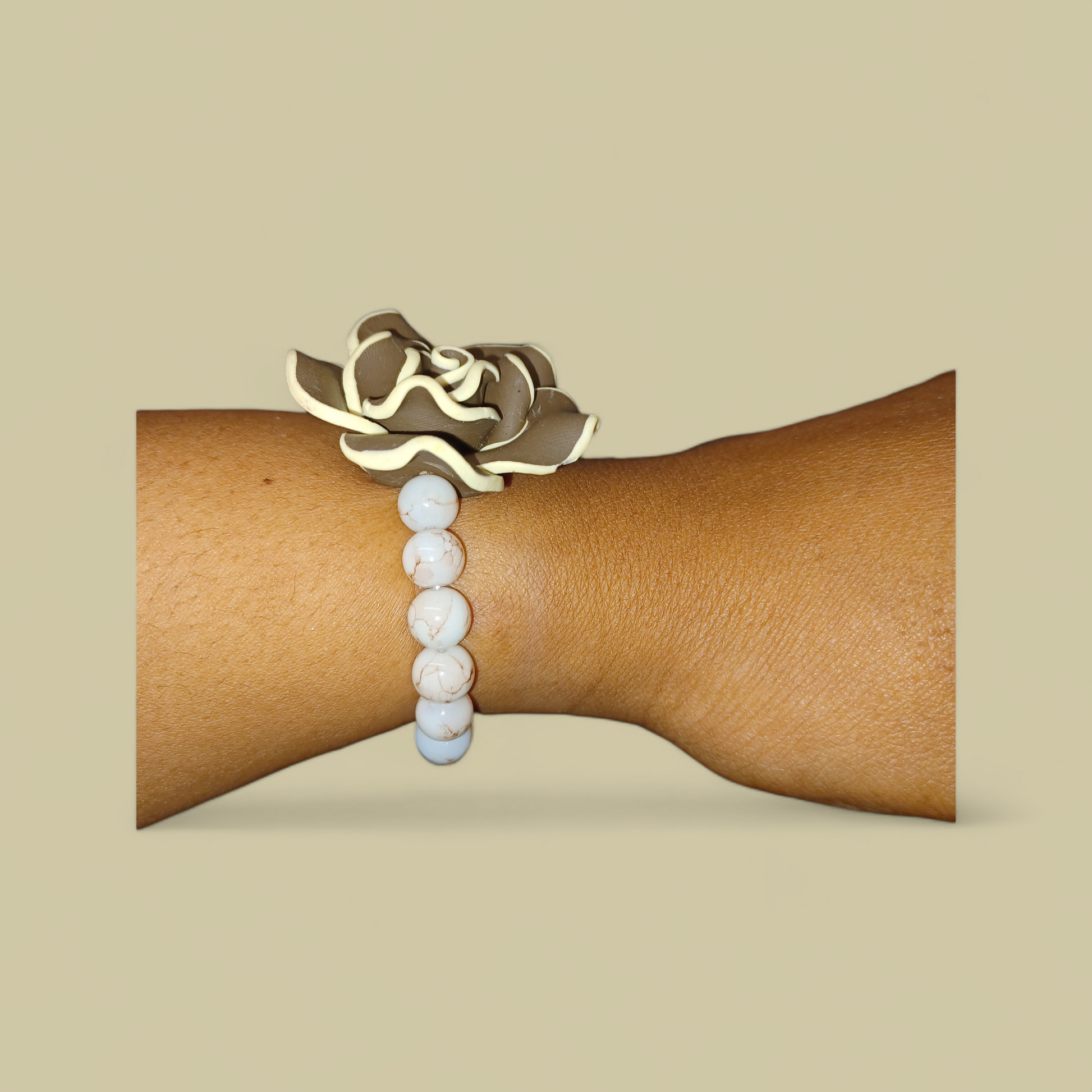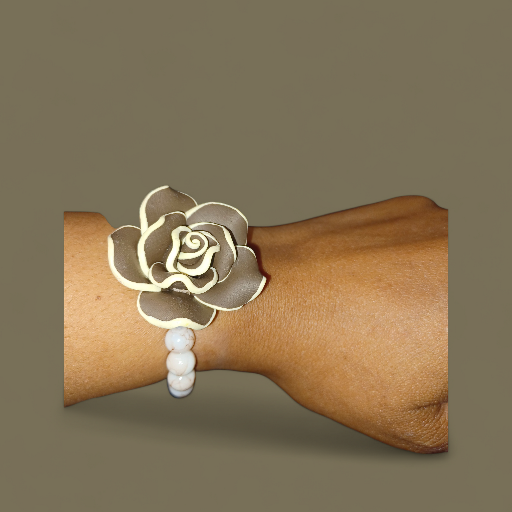 Add a touch of natural elegance to your outfit with our Mushroom Colored Rose Glass Beaded Bracelet. This beautiful piece features a delicate rose design that will complement any style. Elevate your look and make a statement with this timeless accessory. Perfect for any occasion.