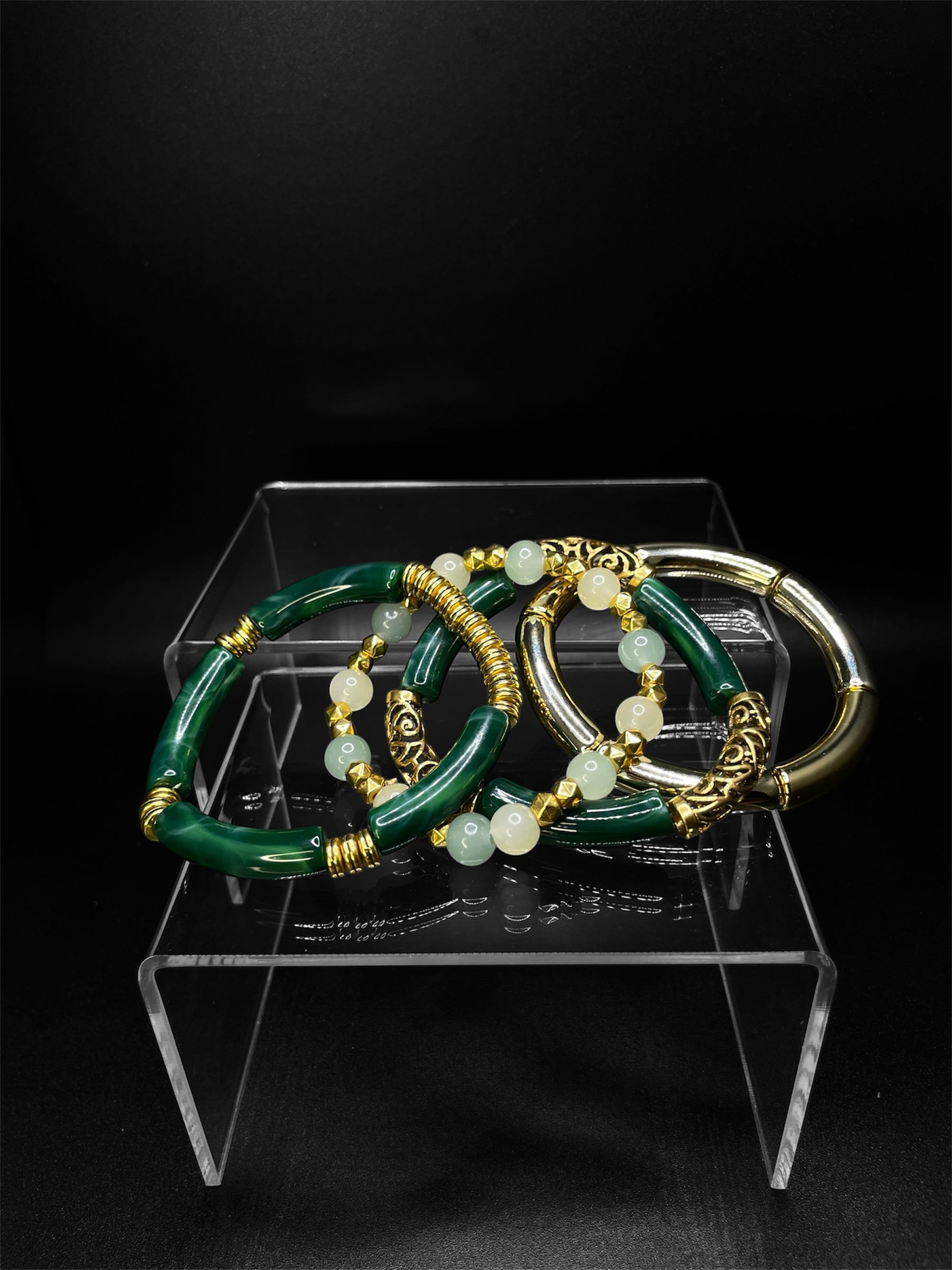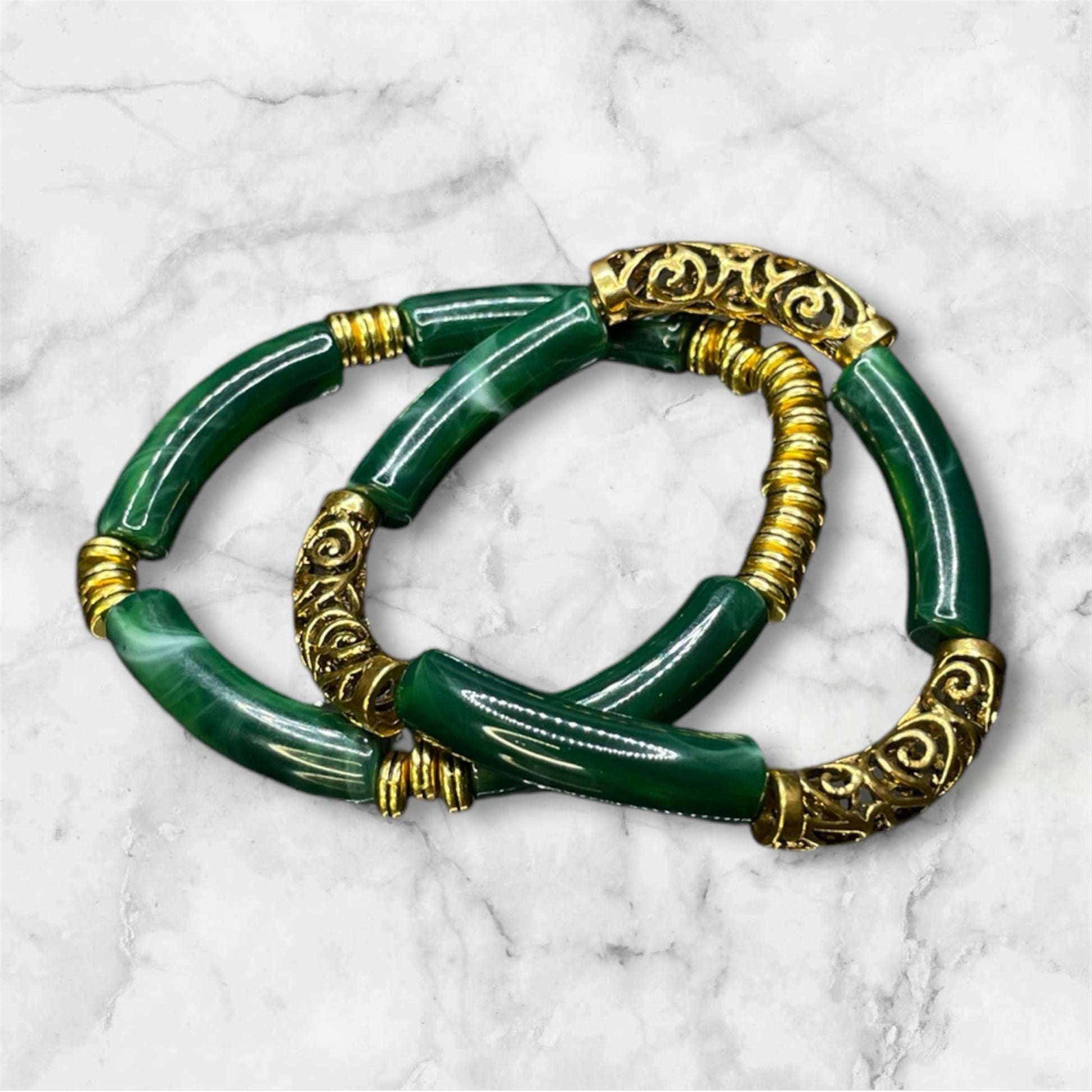 Add a touch of whimsy to your accessory game with this Seaweed Green and Gold Bracelet. Stand out from the crowd and bring a bit of nature with you wherever you go. Who knew seaweed could be so fashionable? You'll have everyone green with envy!